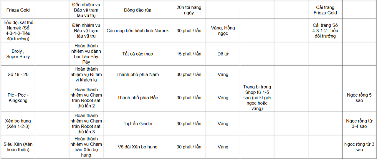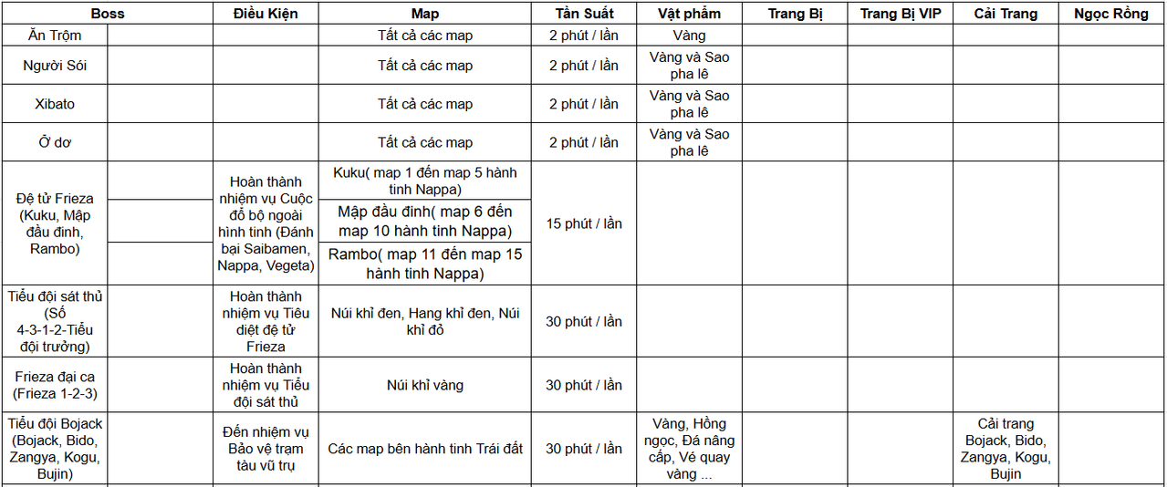 Dưới đây là toàn bộ các Boss trong Ngọc Rồng Awaken bao gồm: điều kiện gặp boss, tần suất boss, vị trí xuất hiện, cũng như phần thưởng cho từng boss: