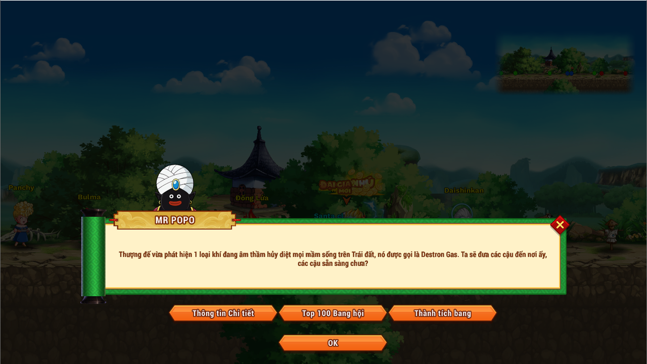 Bước 1: Gặp NPC Mr POPO ở Làng Aru để vào map (Chỉ chủ bang mới có thể mở map) và chọn cấp độ map. Cấp càng cao phần thưởng càng nhiều, quái cũng sẽ càng mạnh.