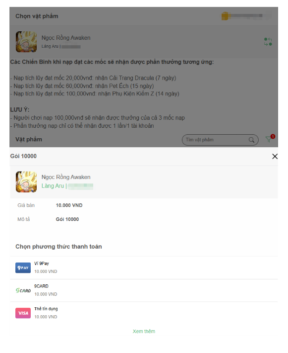 Bước 3: Dưới đây là giao diện Nạp của Ngọc Rồng Awaken. Chiến Binh có thể chọn các gói theo những mệnh giá phù hợp với mình
