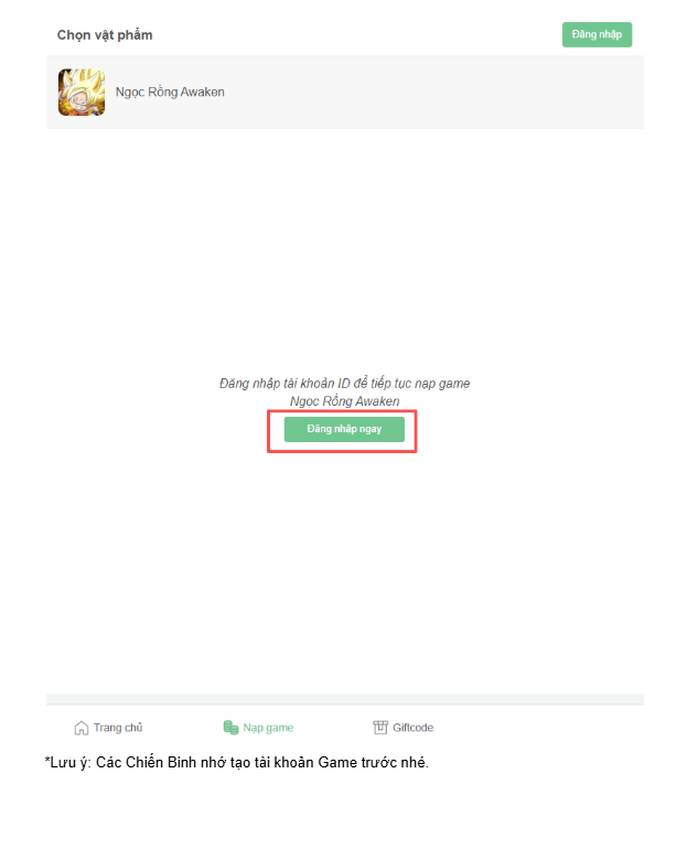 Bước 1: Truy cập vào trang nạp chính thức của Ngọc Rồng Awaken: https://nap.ngocrongawaken.vn/