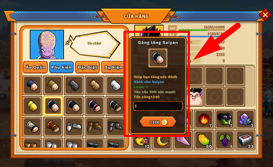 - Mua các trang bị cần thiết như Áo - Quần - Găng để tăng Giáp - HP - Sức đánh