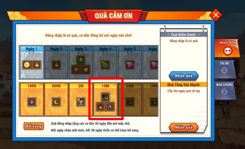 - Chuẩn bị cuồng nộ - bổ huyết - giáp xên (phần thưởng nhiệm vụ, quà thưởng sức mạnh, gói mua chung, mở quà sự kiện, …)