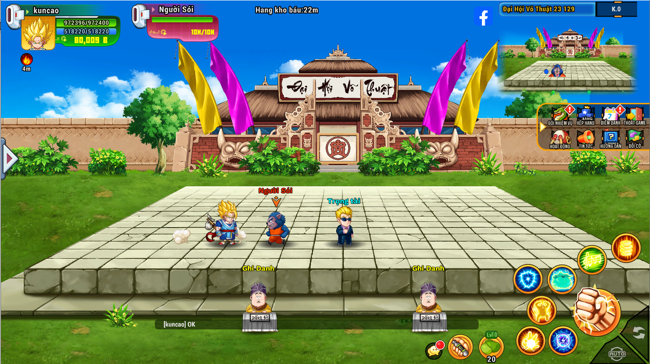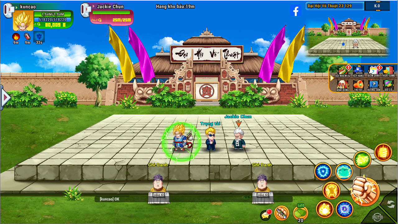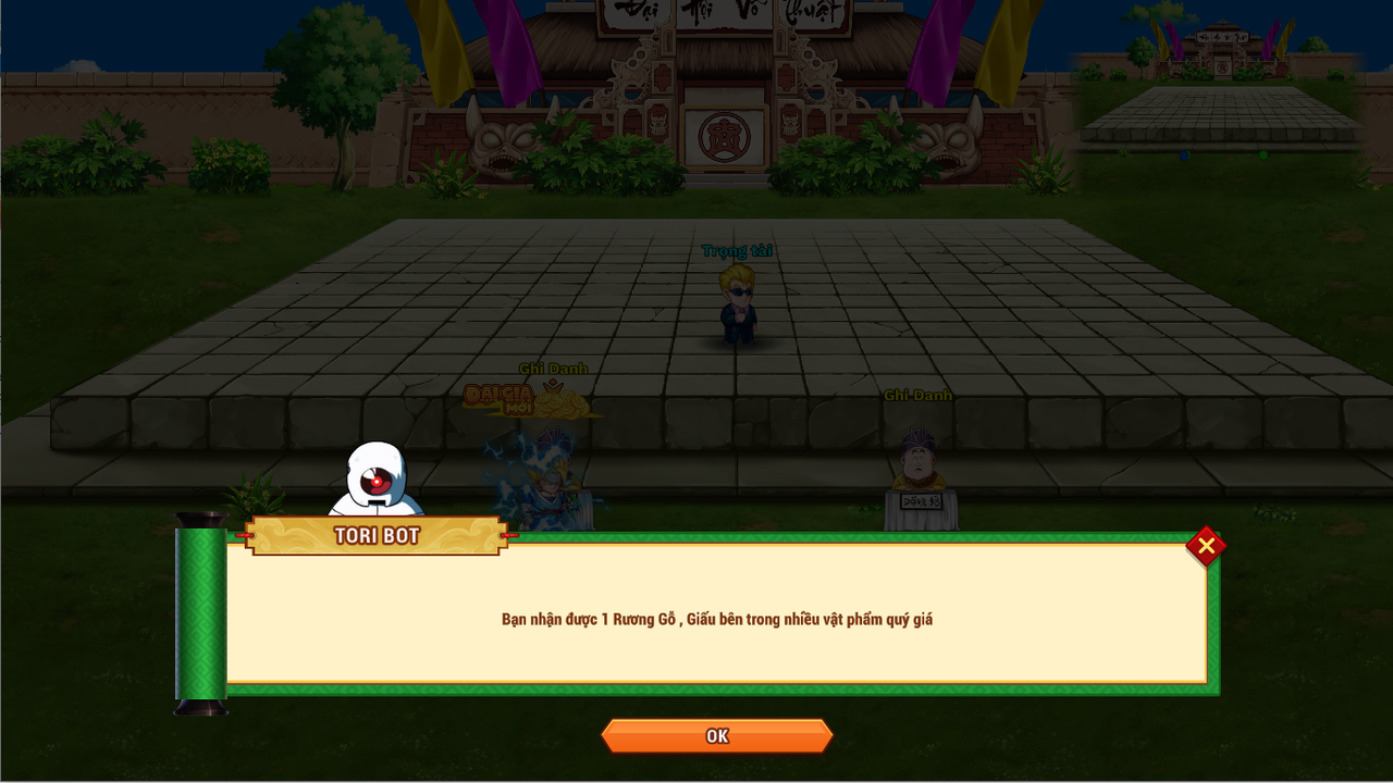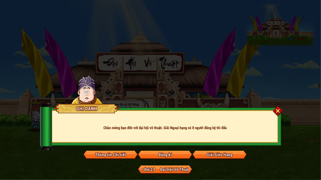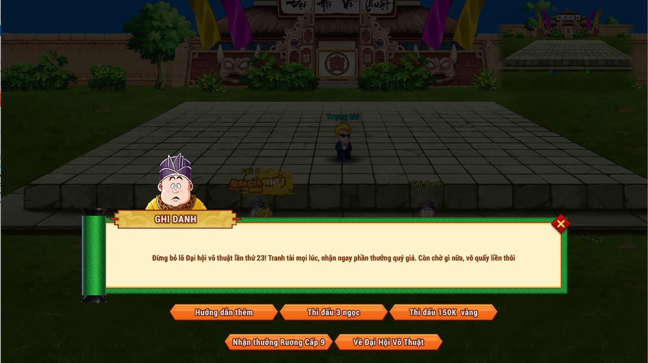 Bước 1: Gặp NPC Ghi Danh ở map Đại Hội Võ Thuật - Đại Hội Võ Thuật lần thứ 23. Chọn phí thi đấu: 1 ngọc hoặc 50k vàng (tăng thêm tương ứng mỗi lần thua)