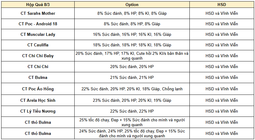 Mở 1 Hộp quà 8/3 các chiến binh sẽ nhận được 1 điểm sự kiện. Các Chiến binh đua top mở Hộp quà 8/3 để nhận những phần thưởng cực giá trị .