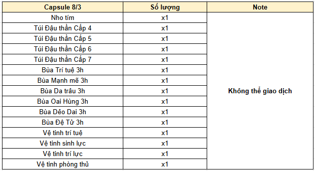 Phần thưởng từ Capsule 8/3 (mỗi ngày chỉ mở tối đa 20 Capsule 8/3)