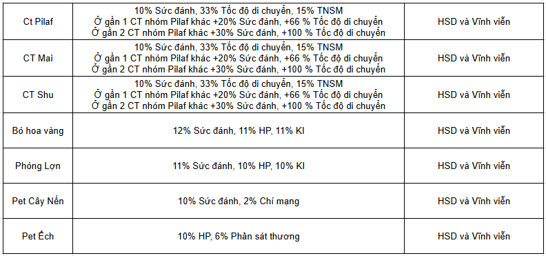 - Chỉ cần ở gần Cải trang của nhóm Pilaf là được tăng sức đánh và tốc độ di chuyển , không phân biệt cải trang gì , không phân phân biệt giống nhau hay không. Ví dụ 2 cải trang Mai farm cùng 1 map thì đều được +20% sức đánh cho mỗi người tính cả cải trang đang mặc là +30% sức đánh