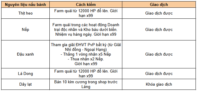 Các nguyên liệu có thể tìm kiếm thông qua các hoạt động trong game: