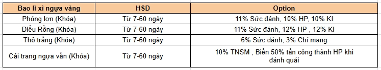 Ngày 1,2,3 Tết khi gặp các NPC trong game và tiến hành chúc tết, các chiến binh sẽ có tỉ lệ nhận được 1 bao lì xì ngựa vàng với mỗi NPC được chúc. Tối đa nhận được Lì xì 10 lần / ngày