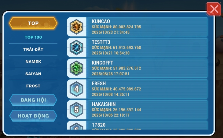 Xem Top 100 người chơi có sức mạnh cao nhất, bang hội mạnh nhất, cũng như top những người săn Boss, top sự kiện, hoạt động nhiều nhất trong game.