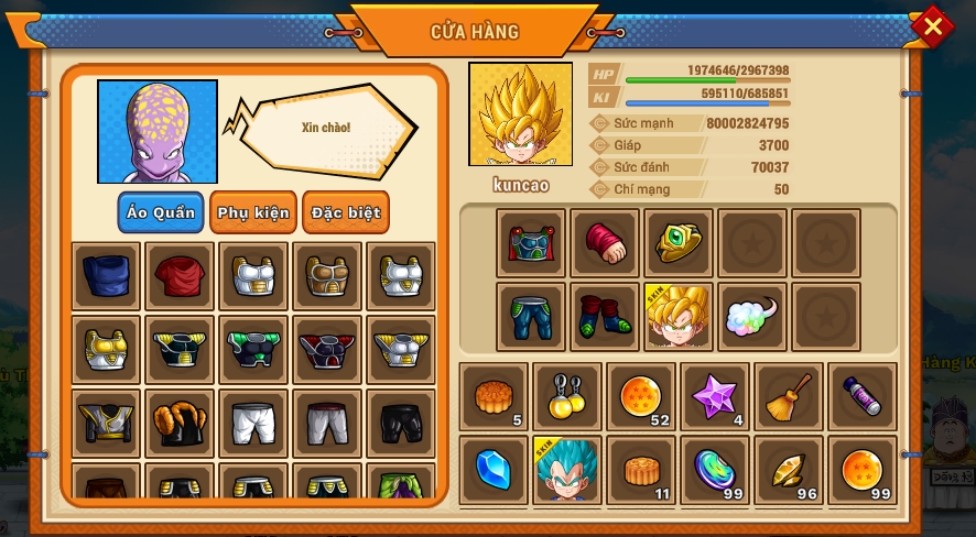 - Cải trang: Mua tại NPC Satan ở Đảo Rùa, giúp gia tăng chỉ số và thay đổi hình dạng nhân vật.