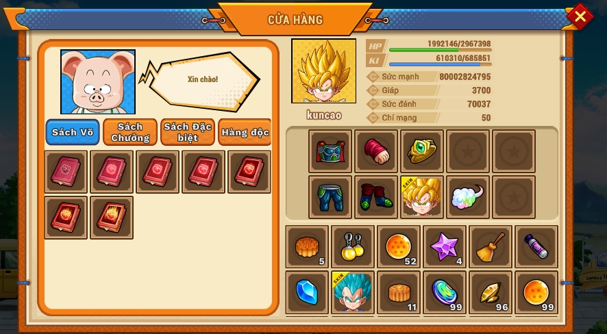 - Sách kỹ năng: Mua tại shop để nâng cấp chiêu thức.