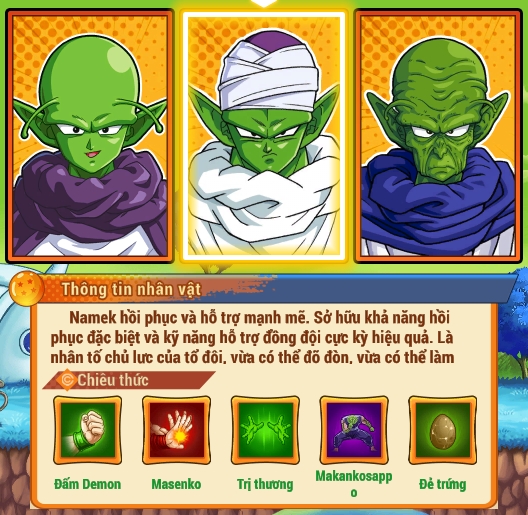 - Namek: Hướng đến vai trò hỗ trợ với kỹ năng trị thương, hồi phục cho đồng đội, là nhân tố không thể thiếu trong các tổ đội (party), giúp cả đội bền bỉ hơn trong các trận đấu.