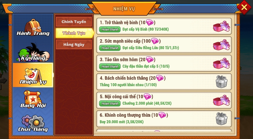 - Nhiệm vụ thành tựu: Hoạt động đặc biệt để kiếm ngọc hồng thông qua việc đạt sức mạnh, đánh quái, và online thường xuyên.