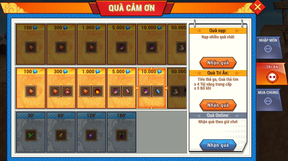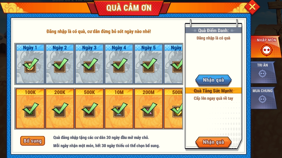 - Quà điểm danh, quà online: Nhận thưởng mỗi ngày khi đăng nhập và online lâu dài.