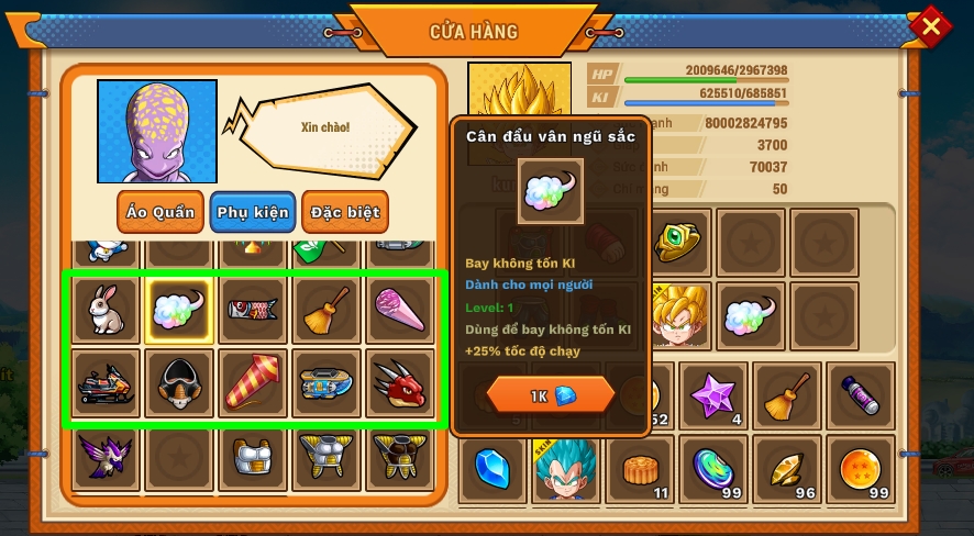 - Phụ kiện bay: Giúp bay mà không tốn KI.