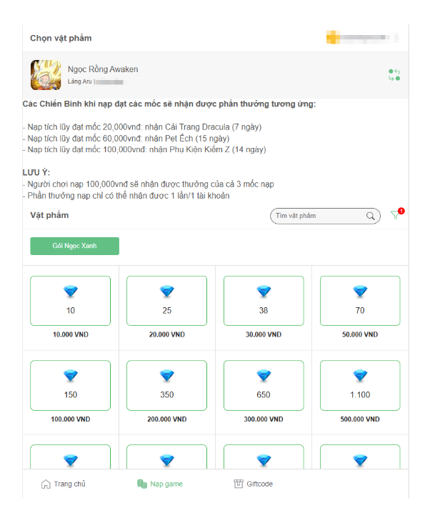 Bước 3: Dưới đây là giao diện Nạp của Ngọc Rồng Awaken. Chiến Binh có thể chọn các gói theo những mệnh giá phù hợp với mình
