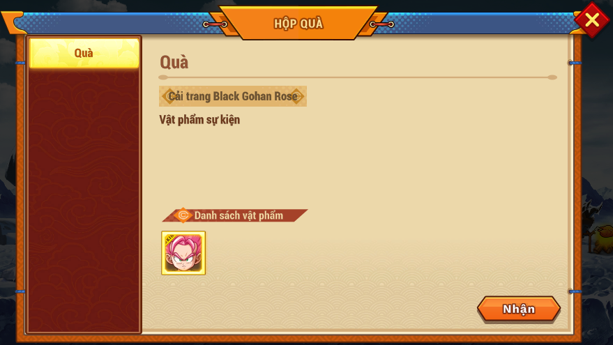 - Nạp tích lũy đạt mốc 200,000vnđ: nhận Cải trang Black Gohan Rose (15 ngày)