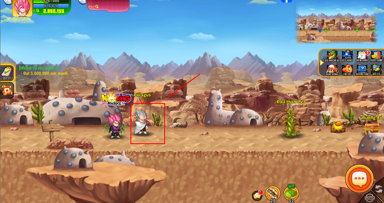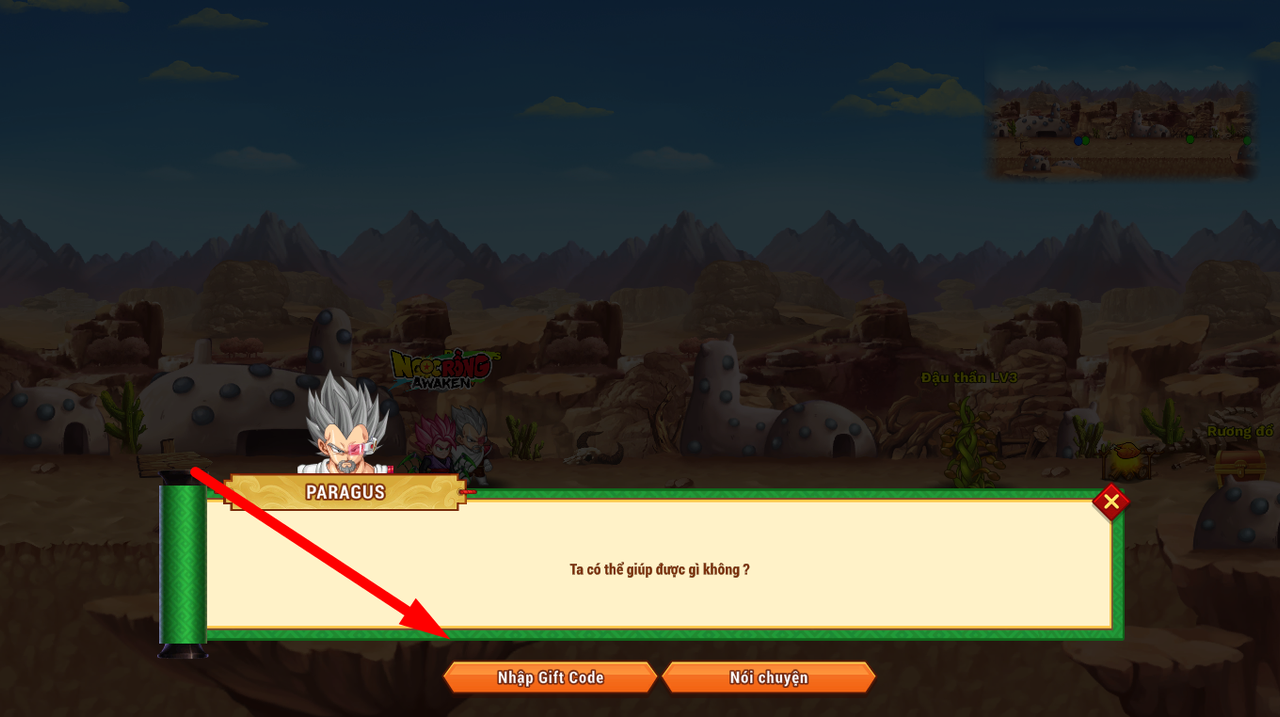 Bước 1: Tại giao diện nhà chính có NPC Gohan/Moori/Paragus/King Cold (tùy thuộc vào từng hành tinh mà NPC sẽ khác nhau nhưng đều chung 1 chức năng)